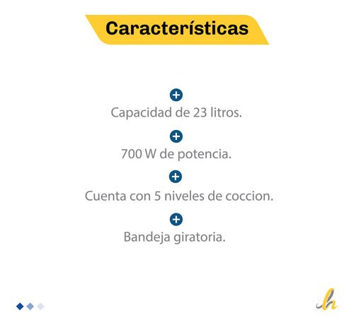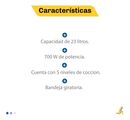 Modelo: KJH-MW2XLX002 Marca: KNAJI Garantía: 12 meses CARACTERÍSTICAS: - 700 W de potencia. - Recordatorio sonorio. - 5 niveles de coccion. - Bandeja giratoria. - Capacidad 23 litros. Dimensiones del packaging: 29 x 48 x 36 cm (Alto x Ancho x Largo) Sku: 72218
