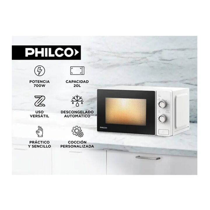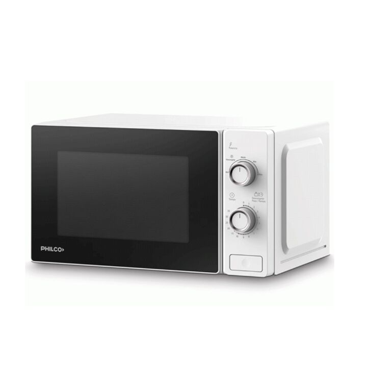 Microondas rotativo. Capacidad: 20 Litros. Potencia: 700 Watts. 5 Niveles de potencia. Descongelado por peso/tiempo. Timer de hasta 35 minutos. Bandeja giratoria. Luz interior led. Medidas sin embalaje: Alto 35.80 x Ancho 44 x Profundidad 25.80 cm