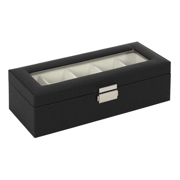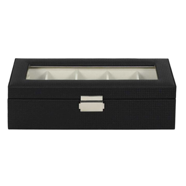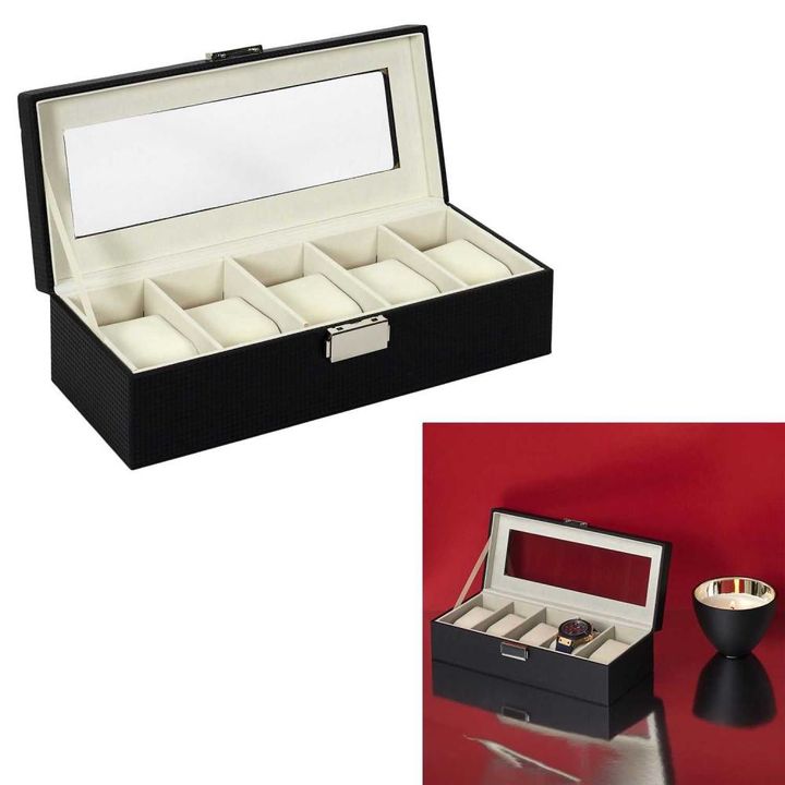 Organizador 5 Relojes Color Negro HD2316 Características: Color: Negro Capacidad: 5 relojes Largo del Producto (cm): 29 Alto del Producto (cm): 8 Profundidad del Producto (cm): 12 Peso del Producto (gr): 700 Composición 1: Plástico - PU (70%) Composición 2: Textil - Poliéster (30%) Garantia: 6 Meses...