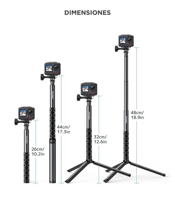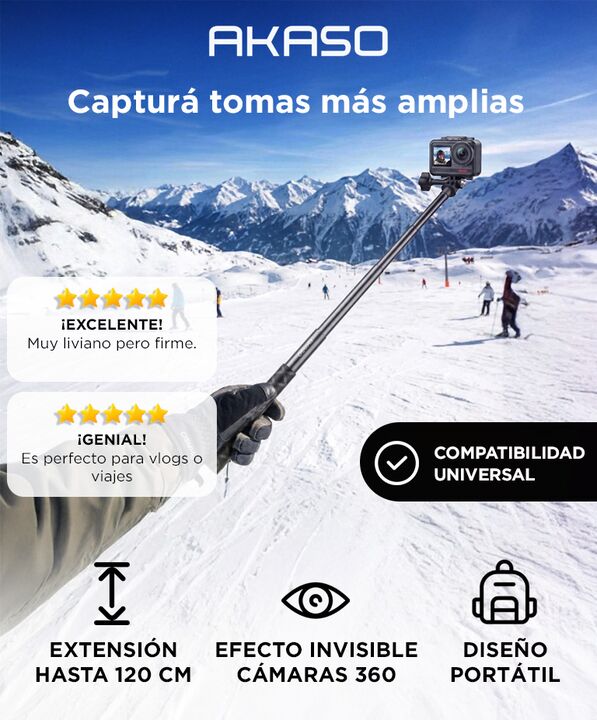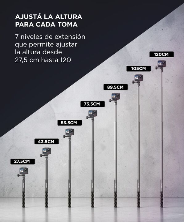 Altura extendida para tomas más amplias: El trípode palo selfie AKASO 120 cm permite capturar imágenes desde mayor distancia, ideal para fotos grupales, vlogs y grabaciones dinámicas con cámaras de acción. Sistema telescópico de 7 niveles de ajuste: Su diseño extensible permite regular la altura seg...