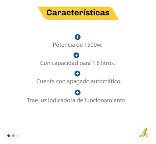Modelo: Kjh-pe15002m Marca: KANJI HOME Garantía: 12 meses CARACTERÍSTICAS: - Voltaje: 220V - Potencia de 1500w. - Con capacidad para 1.8 litros. - Con apagado automático. - Trae luz indicadora de funcionamiento. - Tecnología y rapidez para tus infusiones. Sku: 72364
