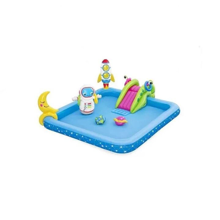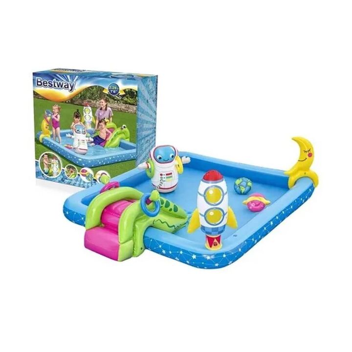 ...Diversión para este verano Vence el calor del verano con tu propio centro de juegos acuáticos fuera de este mundo. El centro de juegos Little Astronaut de Bestway llevará a su hijo a un viaje caprichoso a través de los confines del espacio exterior. Lánzate por el tobogán alienígena con ojos de G...