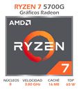 Procesador Amd Ryzen 7 5700G 4.6 GHz 8 Cores 16 Hilos - 100-100000263BOX Especificaciones generales - Nombre: AMD Ryzen 7 5700G - Familia: Ryzen - Serie: Ryzen 5000 Series - Formato: Computadoras de escritorio , Procesador en caja - Nombre de código anterior: Cezanne - Processor Architecture: Zen 3 ...