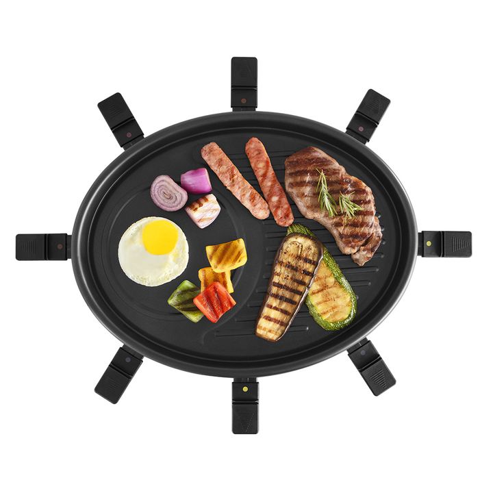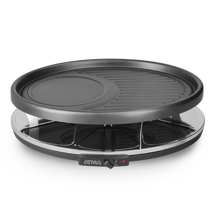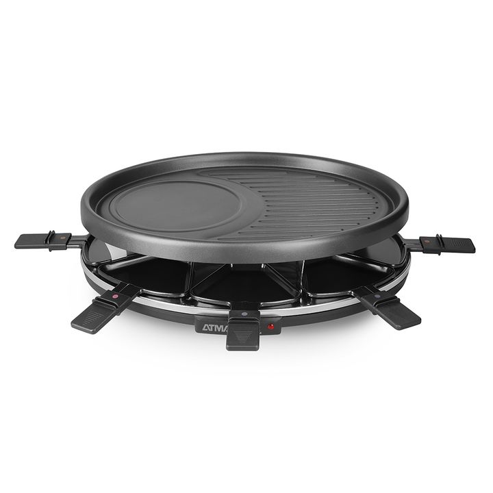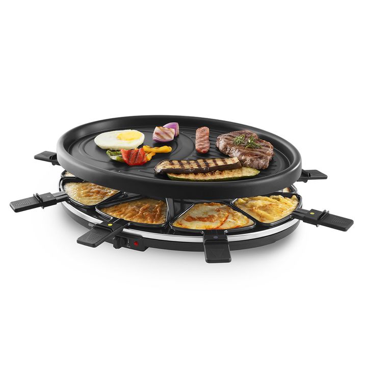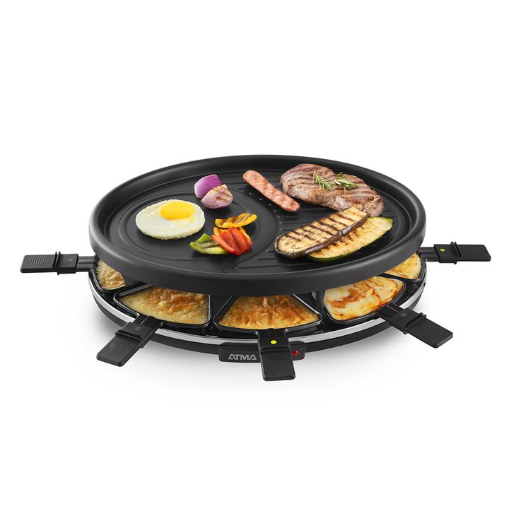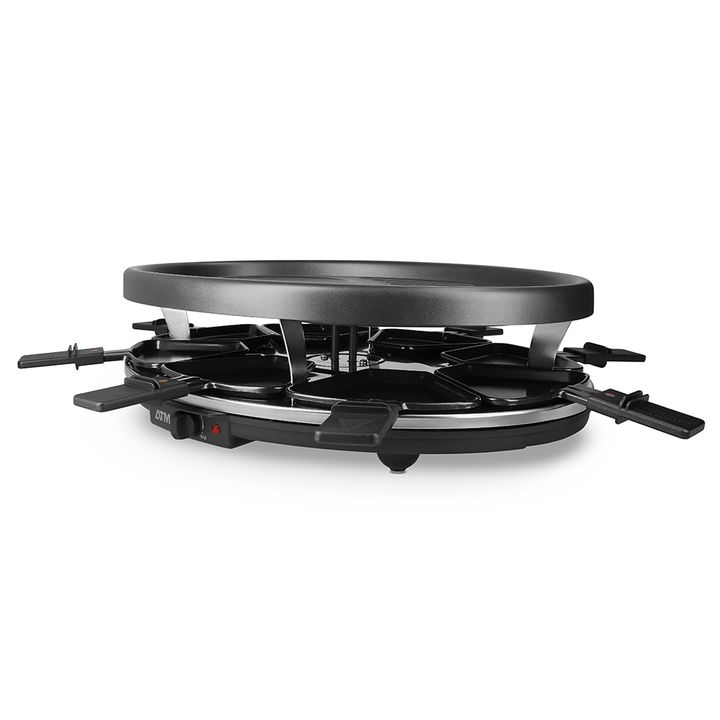 Racletera Eléctrica 1200-1400W RA918P Caracteristicas: *Posee 8 Sartenes para gratinar *Calienta, dora, asa y gratina alimentos *1200-1400 w *Placa de parrilla de metal con recubrimiento antiadherente *Control de temperatura *placa superior para cocinar otros alimentos como verduras o tostar pan *In...