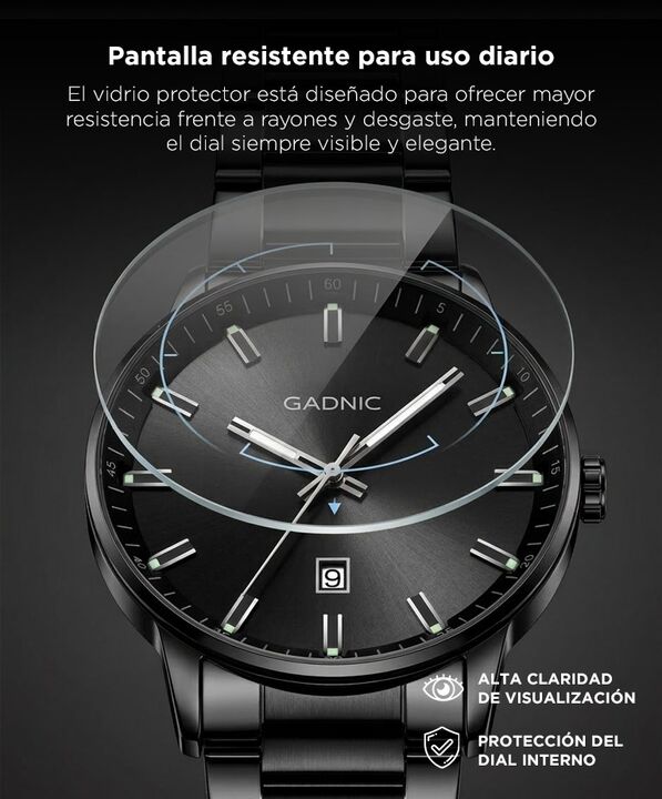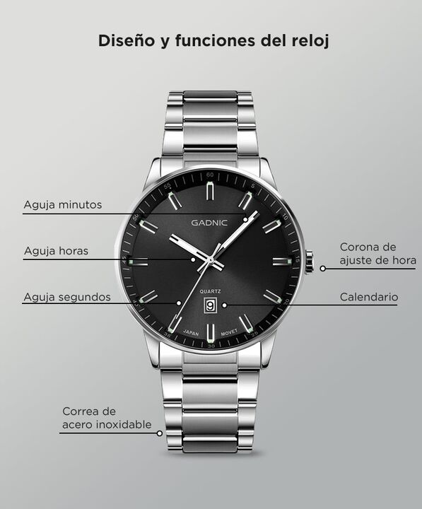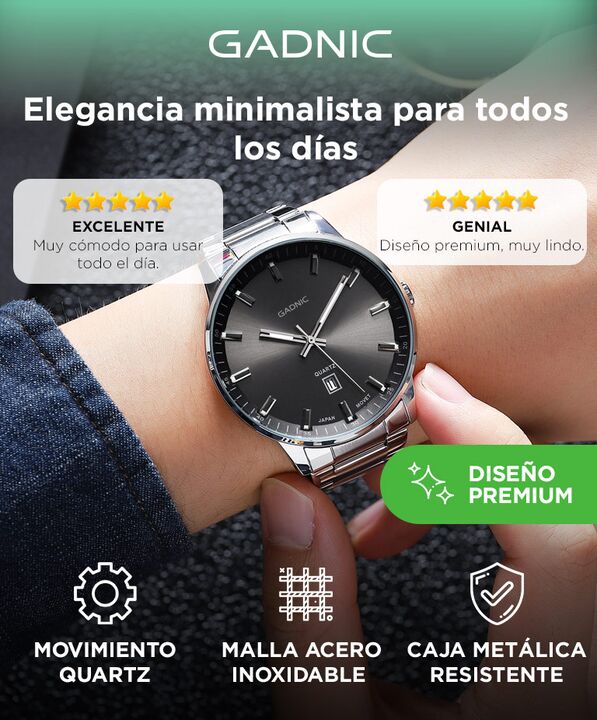 Diseño elegante para uso diario y formal: El reloj analógico Gadnic RELF6/RELF7 combina un dial minimalista con marcadores metálicos que brindan una estética moderna y sofisticada. Su diseño permite utilizarlo tanto en entornos laborales como en eventos formales. Correa de acero inoxidable resistent...