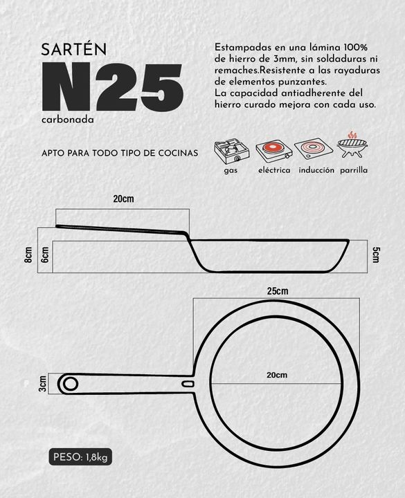 Conoce nuestra sarten de hierro antiadherente N25 Lasarten de hierroN25 no presenta soldaduras remaches ni aditivos quimicos. Su diseno elegante y robusto logra el equilibrio perfecto entre una sartenversatilduraderayresistente. Al estar compuestas 100% por hierro soportan el uso de elementos punzan...