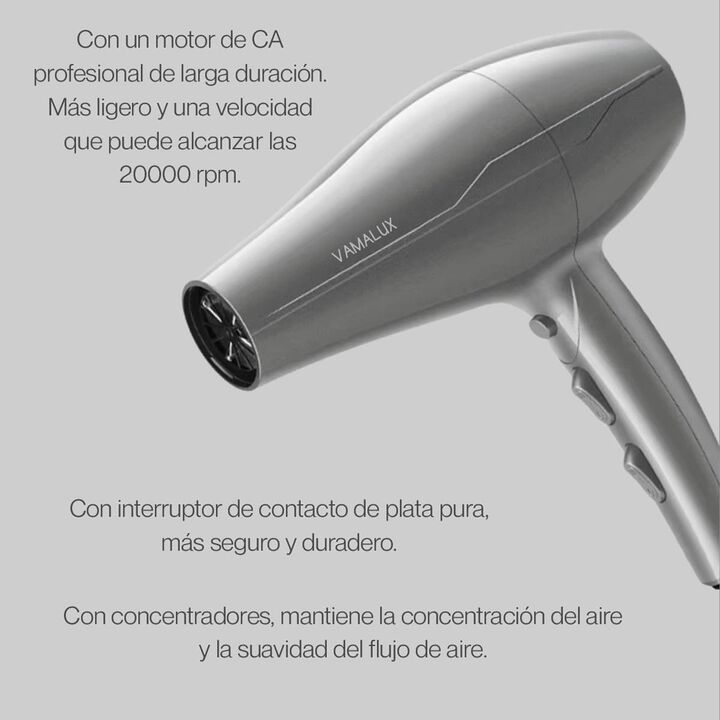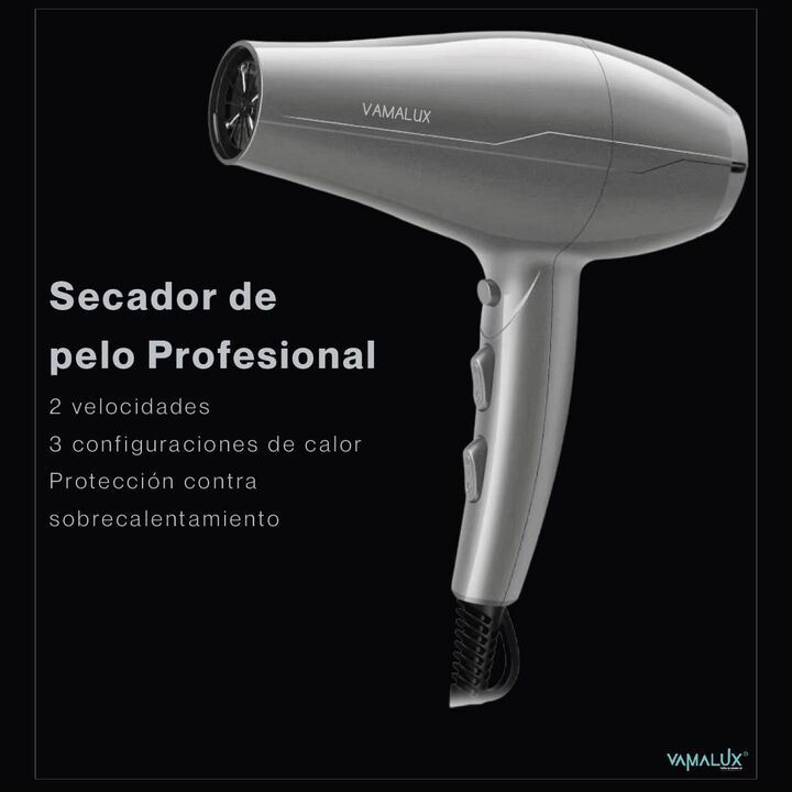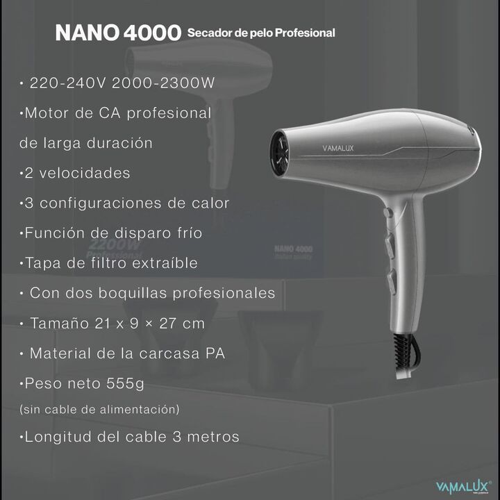 Secador De Pelo Vamalux NANO4000 Profesional: 2300W, Motor AC de Larga Duración y Cable 3 MtsEl Secador de Pelo Vamalux NANO4000 es una herramienta de estilismo potente y duradera, diseñada para ofrecer resultados profesionales con la máxima comodidad. Con una potencia de hasta 2300W y un robusto Mo...
