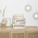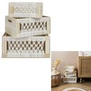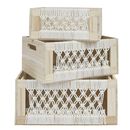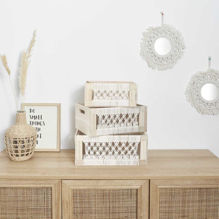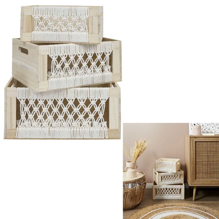 Set de 3 Cajas De Madera Apilables Estilo Boho RG0023 Caracteristicas: Caja 1: Largo (cm): 35 Alto (cm): 15 Profundidad (cm): 25.5 Peso (gr): 516 Composición: Textil - Algodón (20%), Madera - Paulownia (80%) Caja 2: Largo (cm): 30 (Dato faltante de altura) Profundidad (cm): 23.5 Peso (gr): 412 Compo...