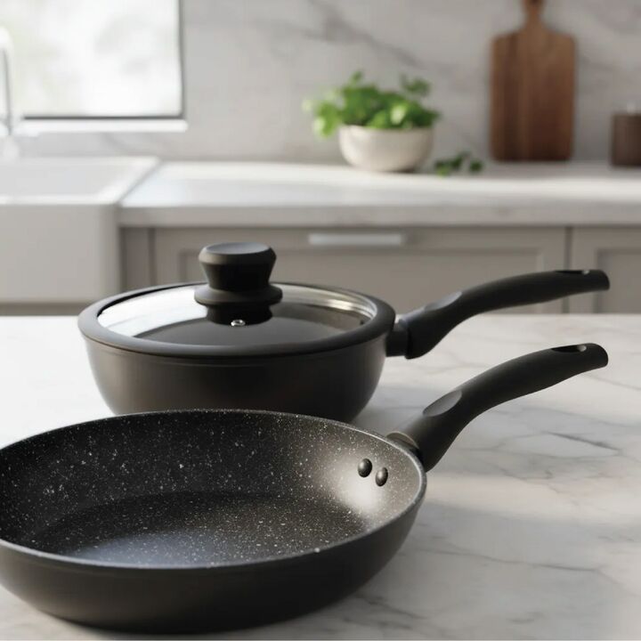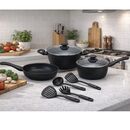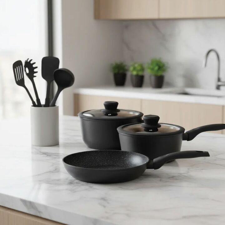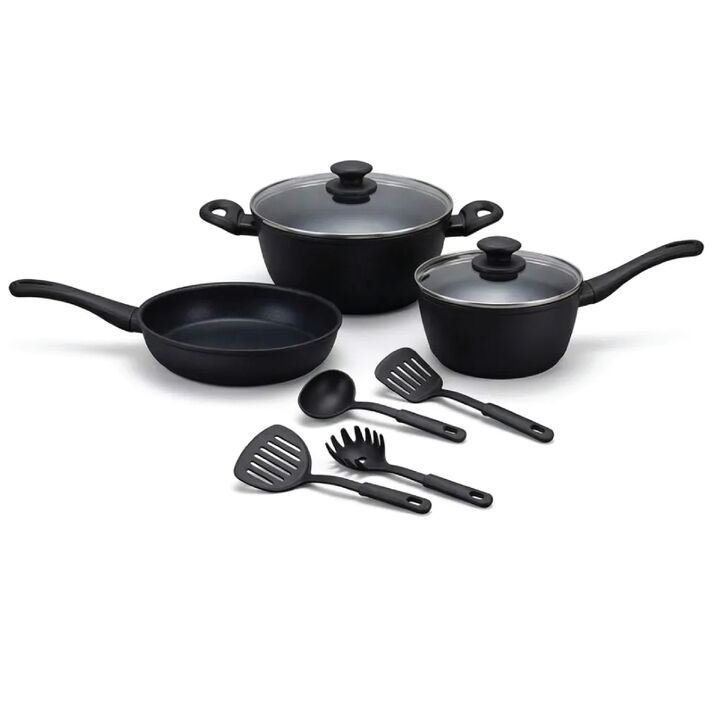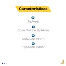 Modelo: JN-A010 Marca: KANJI - Revestimiento antiadherente que evita que los alimentos se peguen - Fabricación en Aluminio - Cacerola de 24 cm con tapa - Cacerola de 20 cm con tapa - Sartén de 24 cm - Tapas de vidrio resistentes al calor UTENSILLOS INCLUIDOS: • Cucharón para sopas y guisos • Cuchara...