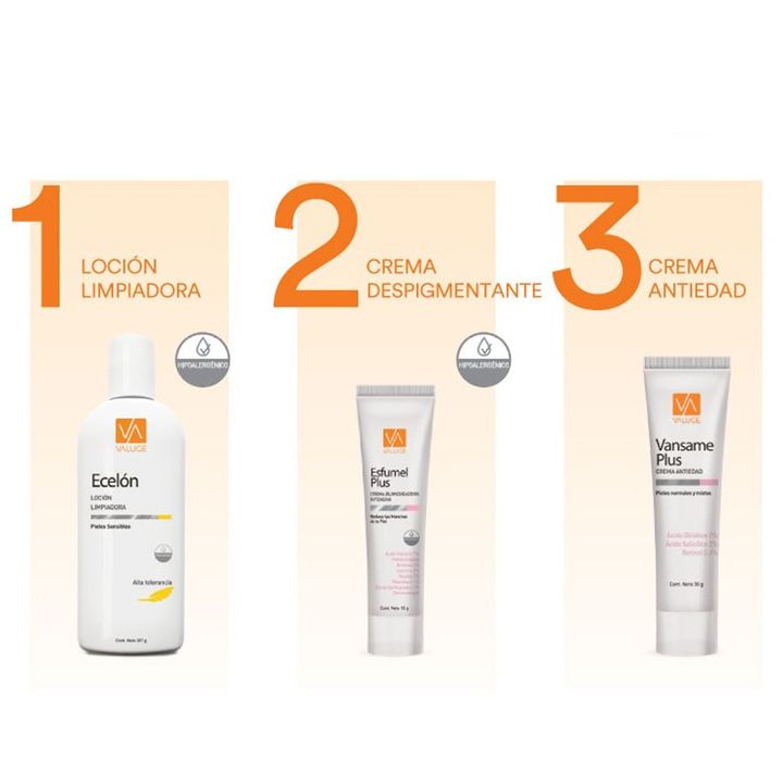Componentes Vansame Plus Crema Antiage Suavizante C/ Acido Sacilico 30gr SKU: 096018 x 1 uni Ecelon Loción Limpiadora Piel Sensible No Irritable 207g Código: 7798095330623 | SKU: 088029 x 1 uni Crema Esfumel Plus Blanqueadora Reforzada Antimanchas 15 Gr Código: 7798095330654 | SKU: 089021 x 1 uni