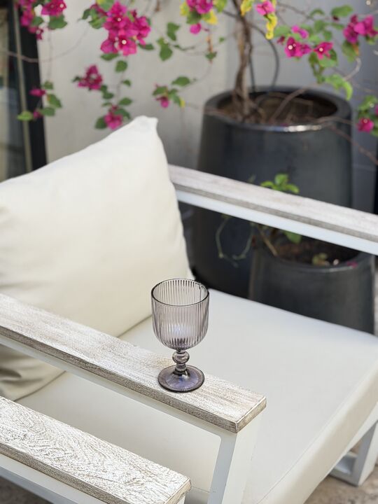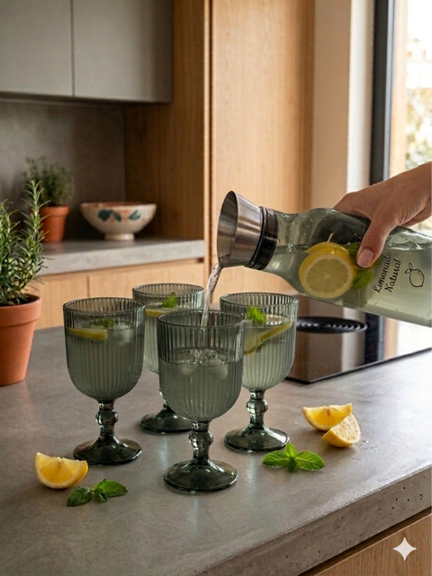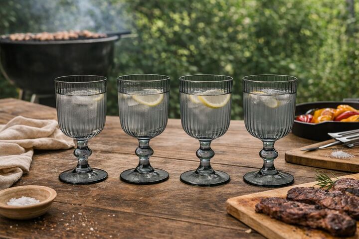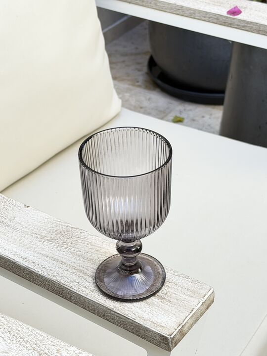 Set x 4 copas labradas en color o transparente de vidrio con pie. Medidas : Altura : 16 cm Diametro de la boca : 9 cm Diametro de la base : 7,3 cm Capacidad : 365 ml Diseño : Moderno , versatil y elegante Perfecto para uso diario u ocaciones especiales, facil de combinar con todo tipo de vajilla o e...