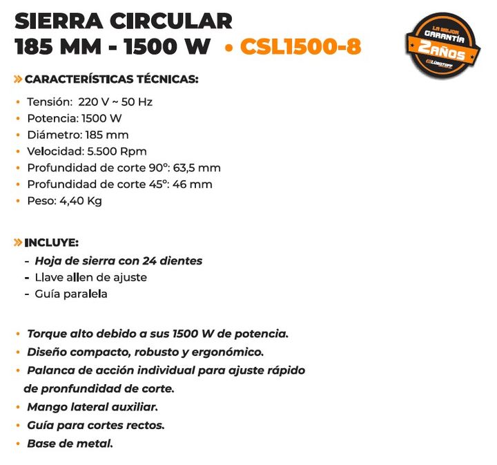 Sierra circular eléctrica Lüsqtoff CSL1500-8 185mm 1500W 220V 50Hz La sierra Lüsqtoff CSL1500-8 es la solución para realizar cortes con precisión y velocidad. Es un producto que hace la tarea más fácil y por lo tanto es excelente para equipar un taller o una carpintería, ya sea profesional o amateur...