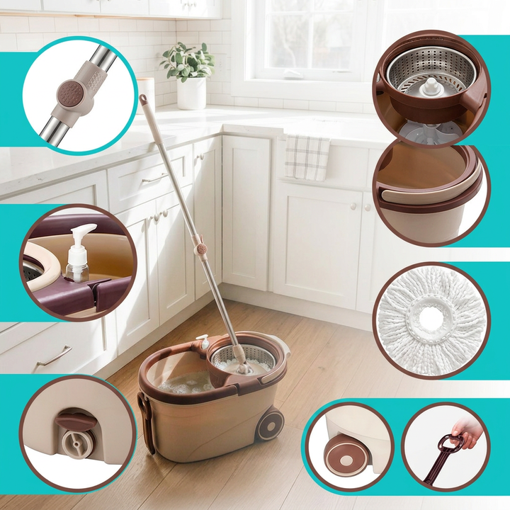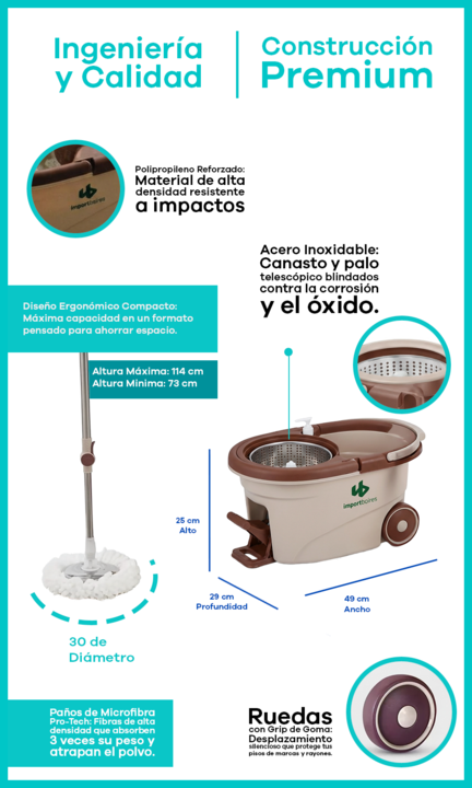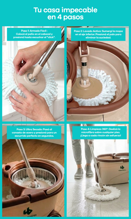 Mopa Giratoria 360 Balde Centrífugo de Acero Inoxidable con Ruedas y Dispenser El sistema de limpieza con mopa giratoria de 360 grados representa una solución integral para el mantenimiento de suelos en entornos domésticos y profesionales. Este conjunto destaca por su durabilidad superior, incorpora...