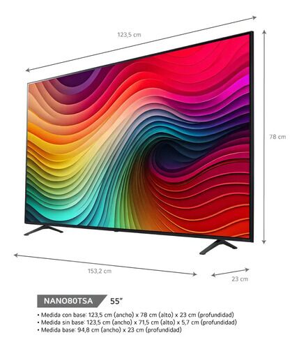 Smart TV LG NanoCell AI 55 UHD 4K Procesador Alpha 7 4K Gen8 - 55NANO80ASA Colores puros en 4K real, colores vivos combinados con detalles asombrosos Calidad de imagen 4K, imágenes mejoradas y sonido envolvente gracias al procesador alpha 7 4K AI Gen8 Nuevo botón de IA, controles de voz y funciones ...