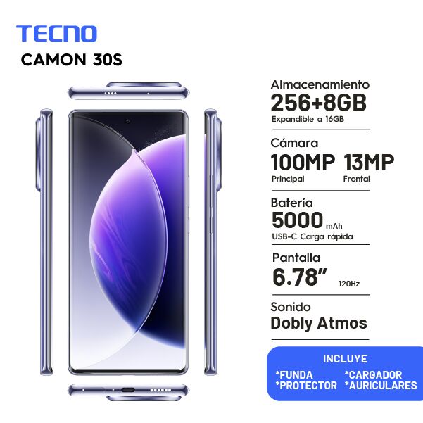Smartphone Tecno Camon 30S Experiencia de uso renovada Disfrutá de un sistema optimizado con HiOS, la personalización de Tecno basada en Android v14. Una interfaz moderna y fluida para un rendimiento superior. Calidad visual sorprendente Su pantalla AMOLED de 6,78 con resolución 1080x2436 y frecuenc...