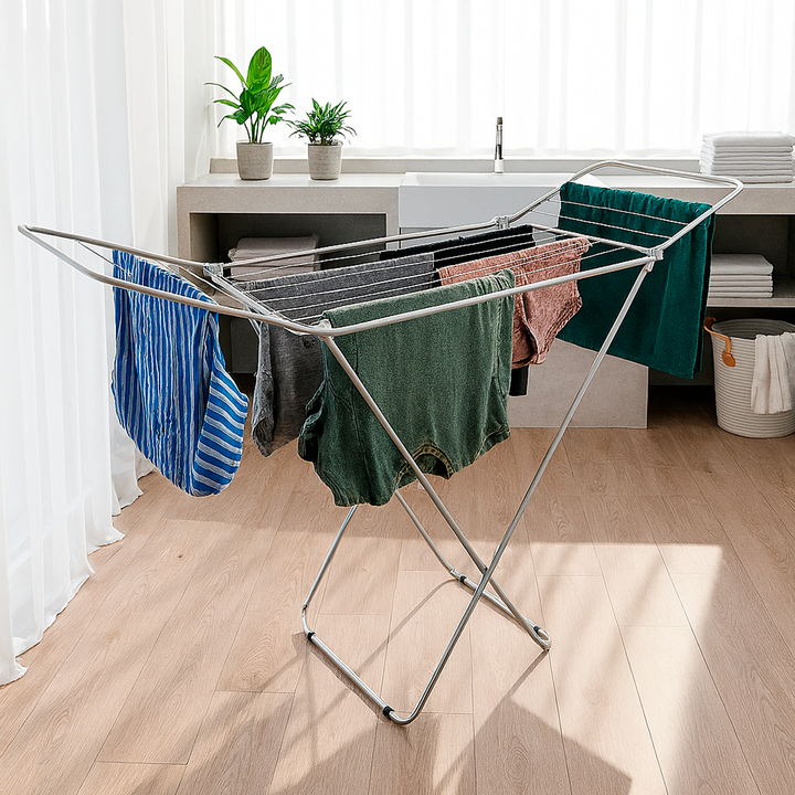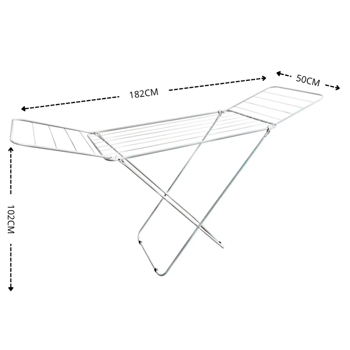 HOGAR ACTUAL TENDER DE ACERO BLANCO 1.80MTRS 182 x 50 x 102 cm SKU: 142953 Tender plegable de pie con alas, fabricado en acero cubierto con pintura epoxi resistente a la humedad. Posee tacos plásticos en la base para evitar que se oxide y que raye el piso. - Medidas extendido: Largo 182 cm, ancho 50...