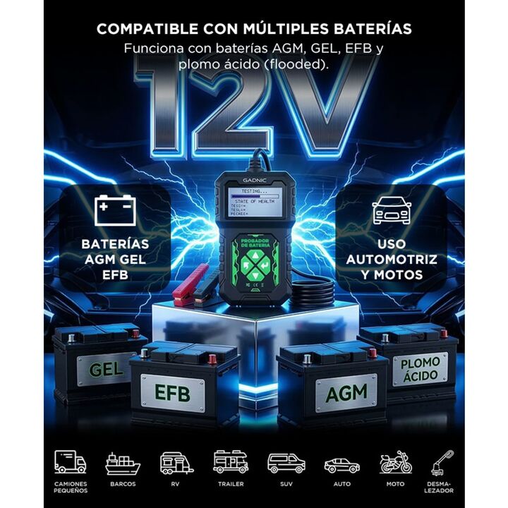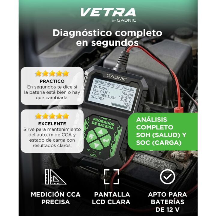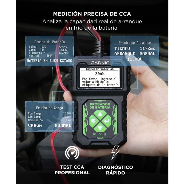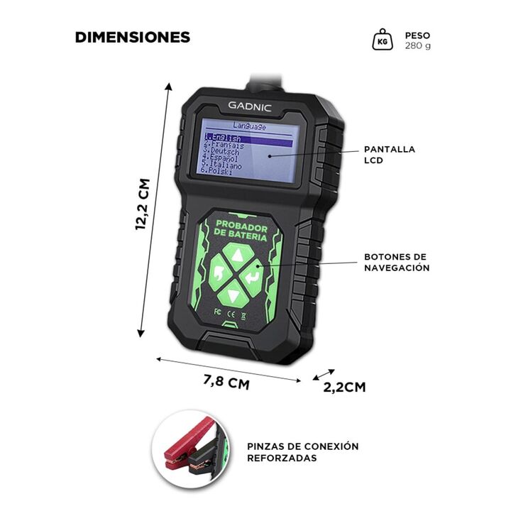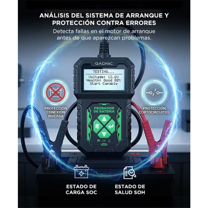 Diagnóstico completo del sistema eléctrico del vehículo El tester de batería Gadnic permite analizar el estado general de la batería y del sistema eléctrico del automóvil. Evalúa batería, arranque y sistema de carga para identificar problemas antes de que afecten el funcionamiento del vehículo. Medi...