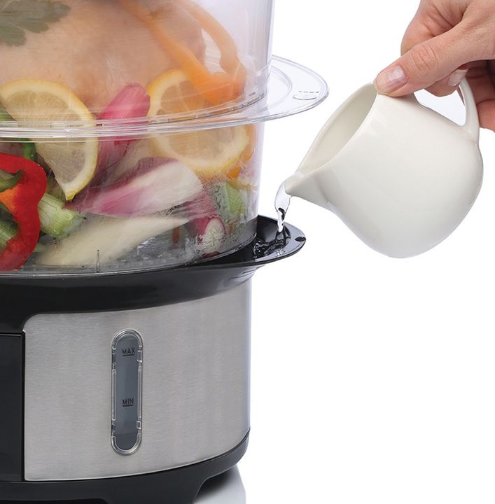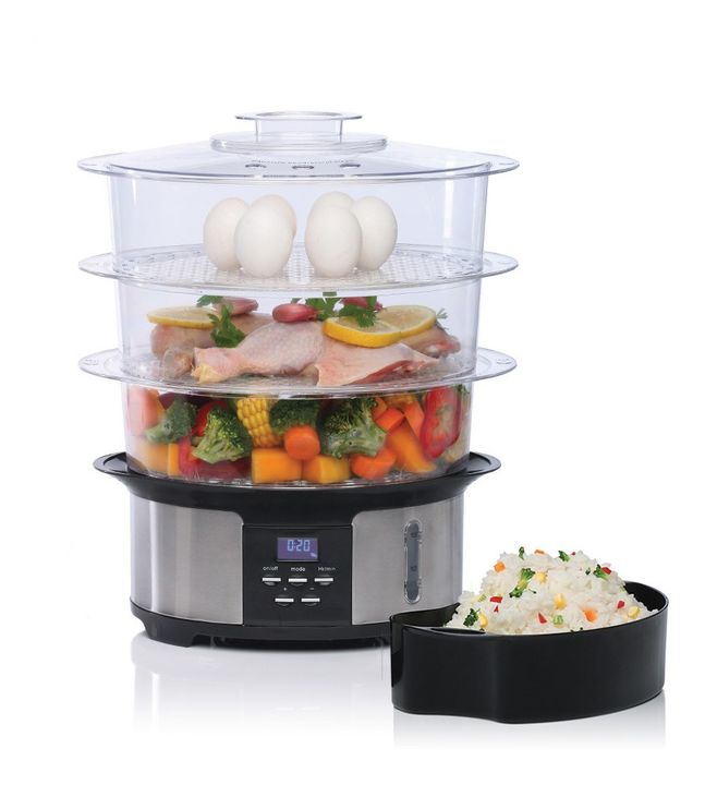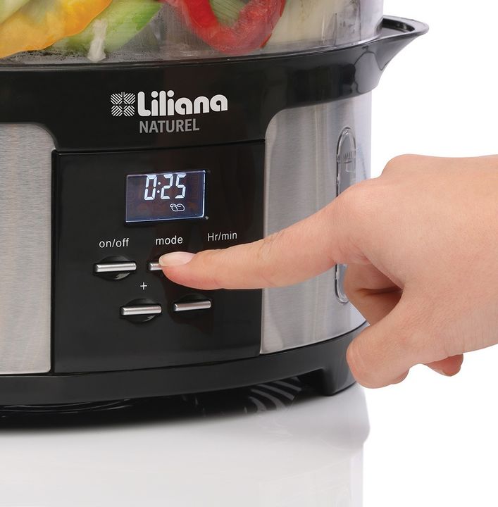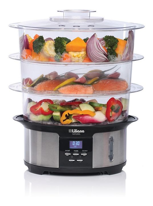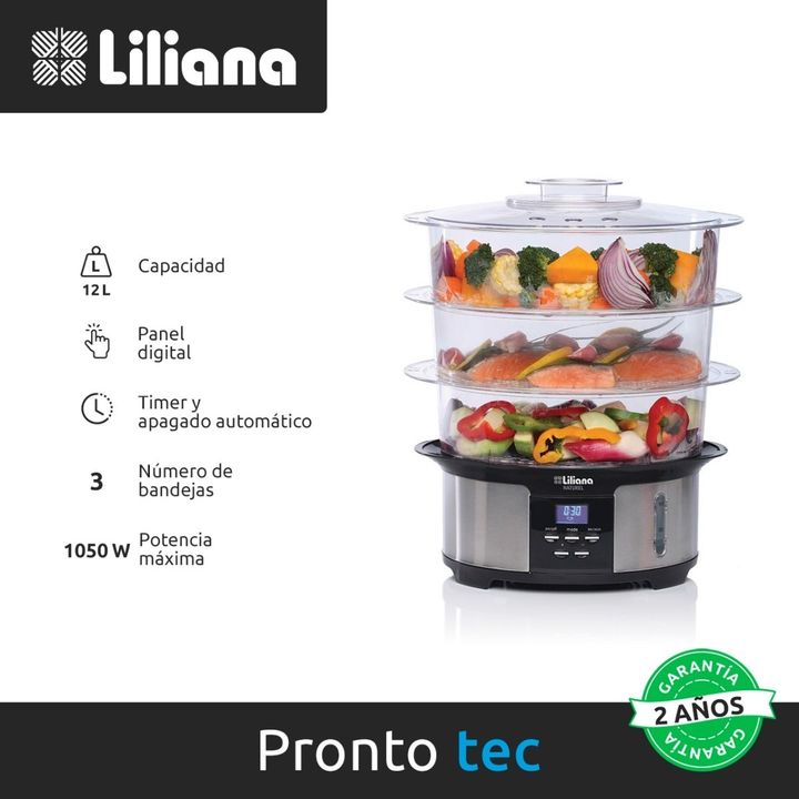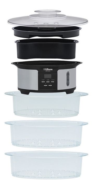 La vaporera AV930 de Liliana cuenta con un práctico diseño, con bases desmontables que permiten ampliar la superficie de cocción, con bandejas, tapa y base apilables con enrolla cable para facilitar el guardado de la misma. Cuenta con display digital, con tiempos pre configurados para distintos tipo...
