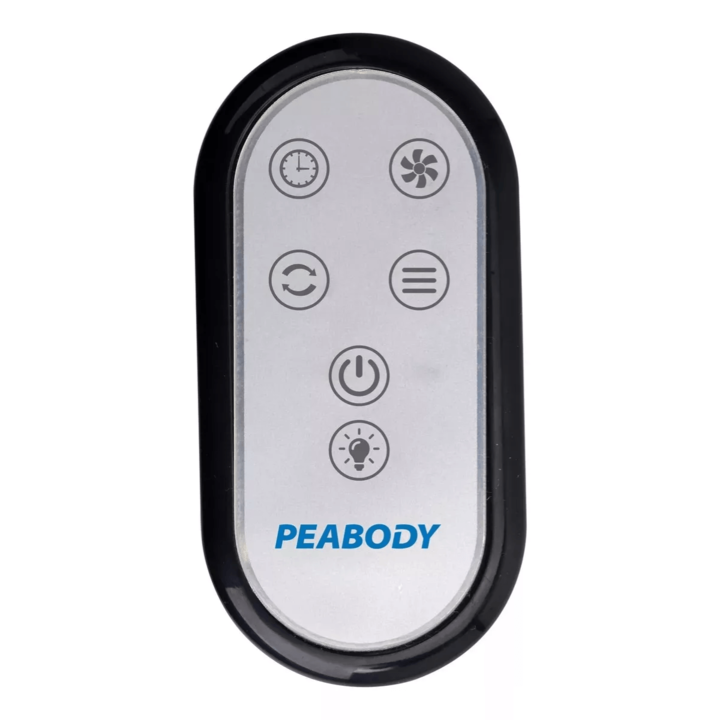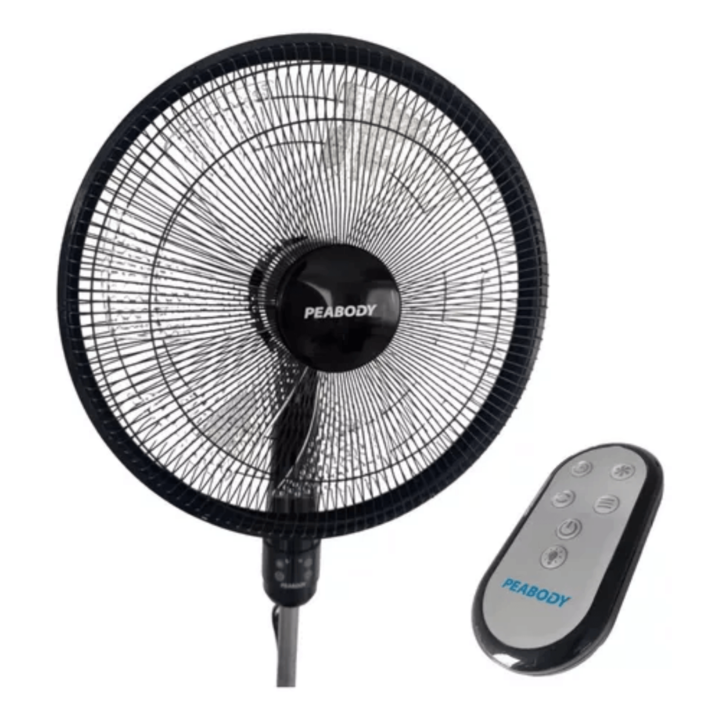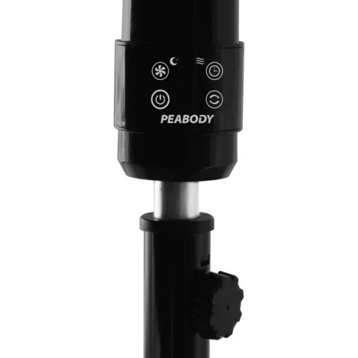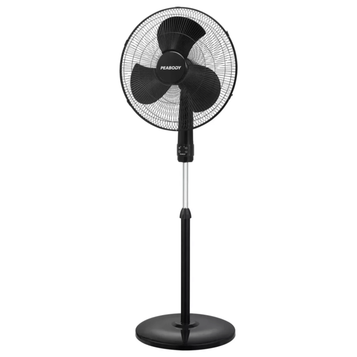 Este ventilador de pie Peabody de 18 pulgadas cuenta con aspas plásticas y un panel de control digital para una fácil selección de velocidades y configuraciones. Su diseño compacto y funcional lo hace ideal para mantener el aire fresco en espacios pequeños o medianos.
